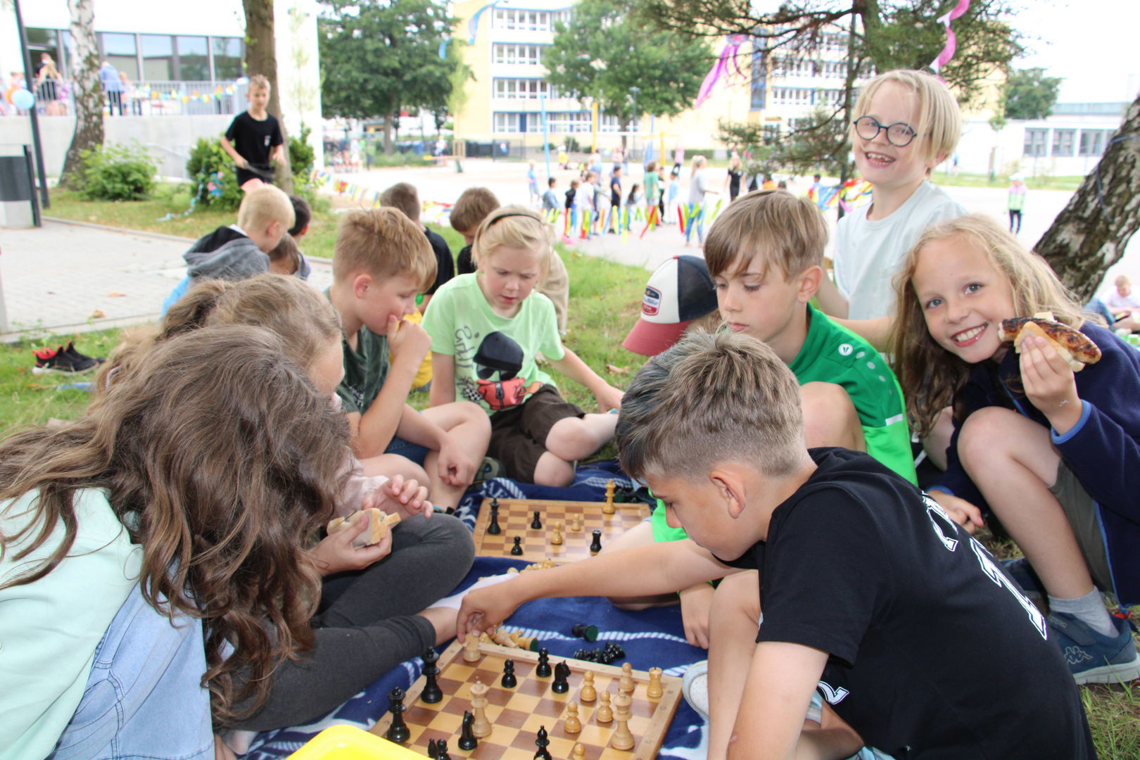 Da kam das anschließende Sommerfest gerade richtig und bot für alle Kinder viele tolle Angebote – Geschicklichkeits- und Gesellschaftsspiele, Schach, Feuerwehr, Seifenblasen, Singen und Musik, Basteln und Malen, Glitzertattoos, Seilspringen und vieles mehr.