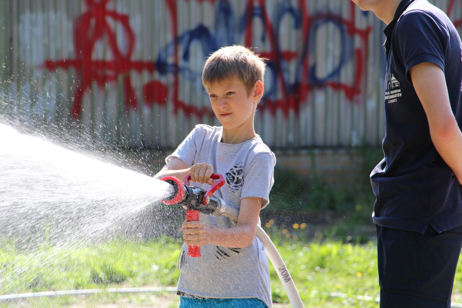 Ein Höhepunkt bot uns wieder die Freiwillige Feuerwehr Ribnitz-Damgarten. Die Schüler und Schülerinnen durften mit der Drehleiter fahren und mit dem Schlauch Dosen abspritzen.