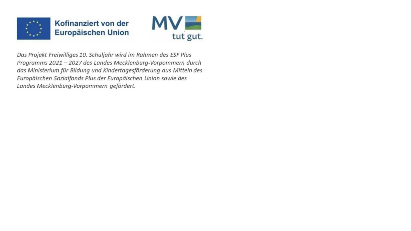 Seit dem Schuljahr 2023/2024 wird das freiwillige 10. Schuljahr nicht mehr an Förderschulen, sondern an Regionalen Schulen und Gesamtschulen angeboten. Dadurch erhalten mehr Schülerinnen und Schüler die Möglichkeit, dieses Angebot wahrzunehmen. Die Finanzierung des landesweiten Projekts ist bis 2028 gesichert und erfolgt mit insgesamt 24 Millionen Euro aus dem Europäischen Sozialfonds Plus (ESF Plus) sowie durch das Land Mecklenburg-Vorpommern.